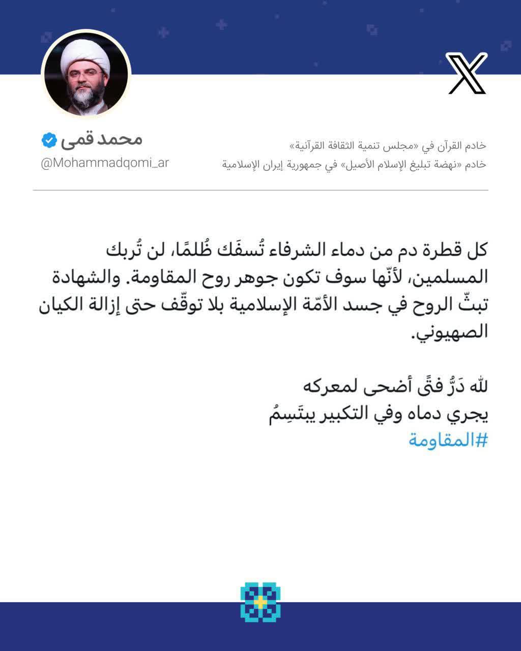 به گزارش روابط عمومی سازمان تبلیغات اسلامی، حجتالاسلام محمد قمی، رئیس سازمان تبلیغات اسلامی در صفحه شخصی خود در شبکه اجتماعی ایکس ویژه مخاطبان عرب زبان به مناسبت شهادت شهدای اخیر لبنان و مقاومت نوشت؛