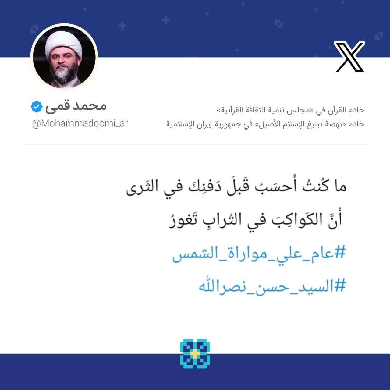 به گزارش روابط عمومی سازمان تبلیغات اسلامی، همزمان با سالروز تشییع پیکر شهید سید حسن نصرالله ، حجتالاسلام محمد قمی، رئیس سازمان تبلیغات اسلامی در صفحه شخصی خود در توئیتر (ویژه مخاطبان عربزبان) با انتشار بیتی از ابوالطیب متنبّی، شاعر نامدار عرب و ملقب به «امیرالشعرا»، یاد «سید شهدای امت» را گرامی داشت و اندوه فراق او را روایت کرد.