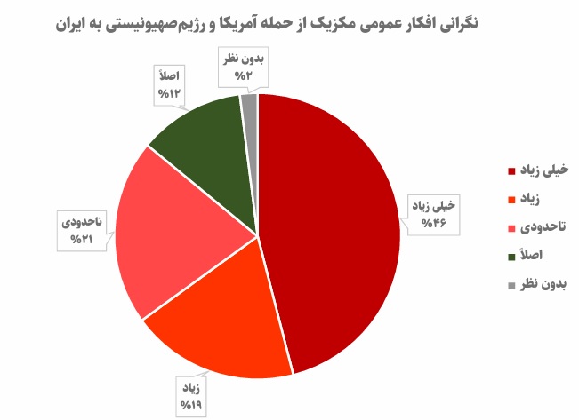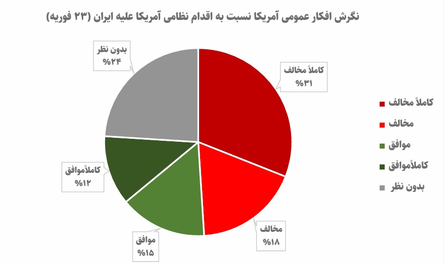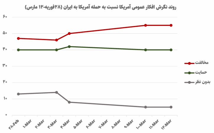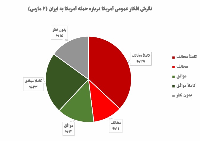 «اکونومیست» در نظرسنجیهایی که از 14 روز قبل از شروع حمله به ایران جمعآوری کرده، اعلام کرد که 49 درصد افکار عمومی آمریکا با حمله به ایران مخالفت کردهاند و تنها 27 درصد با آن موافق هستند. در این میان، 31 درصد کاملا مخالف، 18 درصد مخالف، 15 درصد موافق، 12 درصد کاملا موافق، و 24 درصد بدون نظر بودهاند.