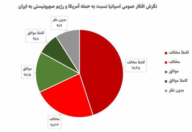 طبق نظرسنجی موسسه تحقیقاتی «۴۰Db» برای روزنامه « EI Pais» و رادیو « Canada SER»، حدود ۶۸ درصد از مردم اسپانیا با حمله نظامی آمریکا و رژیم صهیونیستی به ایران مخالف هستند. این میان، ۴۵ درصد مردم اسپانیا کاملا با جنگ مخالفاند، ۲۳ درصد مخالف، ۱۵ درصد موافق، ۸ درصد کاملا موافق و ۹ درصد بدون نظر بودهاند.