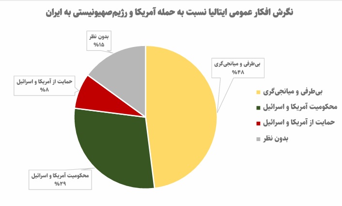 در ایتالیا نیز موسسه Youtrend نظرسنجیای را برای شیکه Sky TG24 این کشور انجام داده که نشان میدهد 48 درصد مردم این کشور خواستار بیطرفی دولت خود در میدان جنگ شدهاند. علاوهبراین، 29 درصد از مردم نیز خواستار محکومیت حملات آمریکا و اسرائیل و برقراری آتشبس فوری هستند. در این بین، تنها 8 درصد از این حملات حمایت کرده و 15 درصد نیز ممتنع بودهاند.
