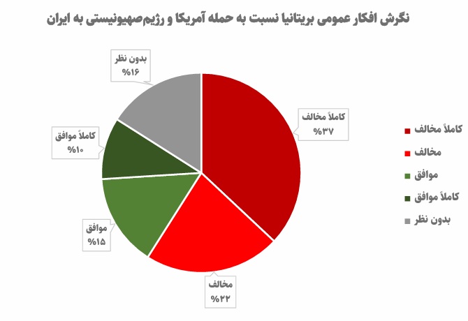 موسسه Yougov نظرسنجی گستردهای را از بیش از 12 هزار نفر از شهروندان اسکاتلند، ولز، انگلیس و ایرلند شمالی درباره حمله نظامی به ایران انجام داده و اعلام کرد که 59 درصد مردم بریتانیا مخالفت خود را با این جنگ اعلام کردهاند. همچنین، 16 درصد رای ممتنع داده و تنها 25 درصد از این جنگ حمایت کردهاند. طبق این آمار، 37 درصد کاملا مخالف جنگ، 22 درصد مخالف، 15 درصد موافق، 10 درصد کاملا موافق، و 16 درصد هم نظر خاصی ارائه ندادهاند.