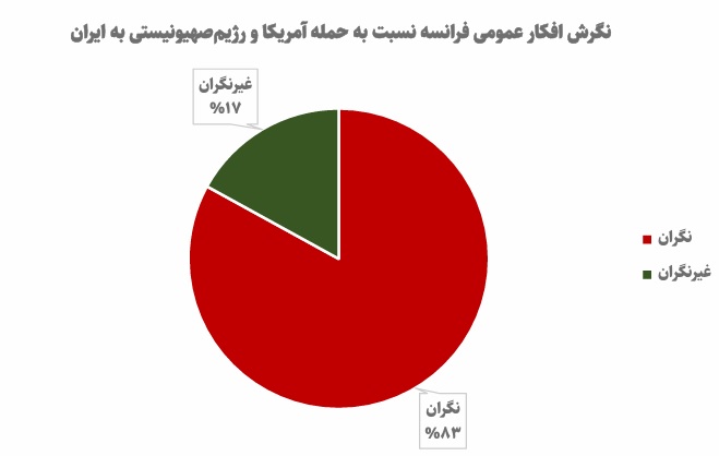 اندیشکده Elabe در نظرسنجی خود اعلام کرد که 83 درصد مردم فرانسه نسبت به جنگ آمریکا و اسرائیل علیه ایران ابراز نگرانی میکنند اما به نظر میرسد نسبت به نظرسنجی قبلی که انجام شده بود، نگرانیها کاهش 4 درصدی نشان میدهد. از آنجایی که فرانسویها، این جنگ را اصلیترین علت افزایش قیمت بنزین را در کشور میدانند، 70 درصد از آنها از دولت خود میخواهند اقداماتی را نظیر کاهش مالیات بر بنزین، کمکهزینه هدفمند انرژی، و سپر تعرفهای وضع کند. اوضاع بهگونهای است که طبق نظرسنجیها، تنها 32 درصد از مردم فرانسه از جنگ حمایت میکنند.