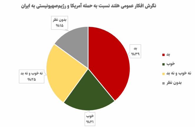 دادههای موسسه Ipsos I&O هلند در نظرسنجی خود از شهروندان این کشور درباره جنگ نشان داد که اغلب آنها به جنگی که علیه ایران بهراه افتاده، انتقاد دارند بهطوریکه 39 درصد مخالفت خود را اعلام کرده و 21 درصد موافق جنگ هستند. به رغماینکه نیمی از مردم هلند به حملات علیه ایران واکنش نشان ندادهاند، باز هم 73 درصد شهروندان هلند، نگران وابستگی دفاعی اروپا به آمریکا هستند.