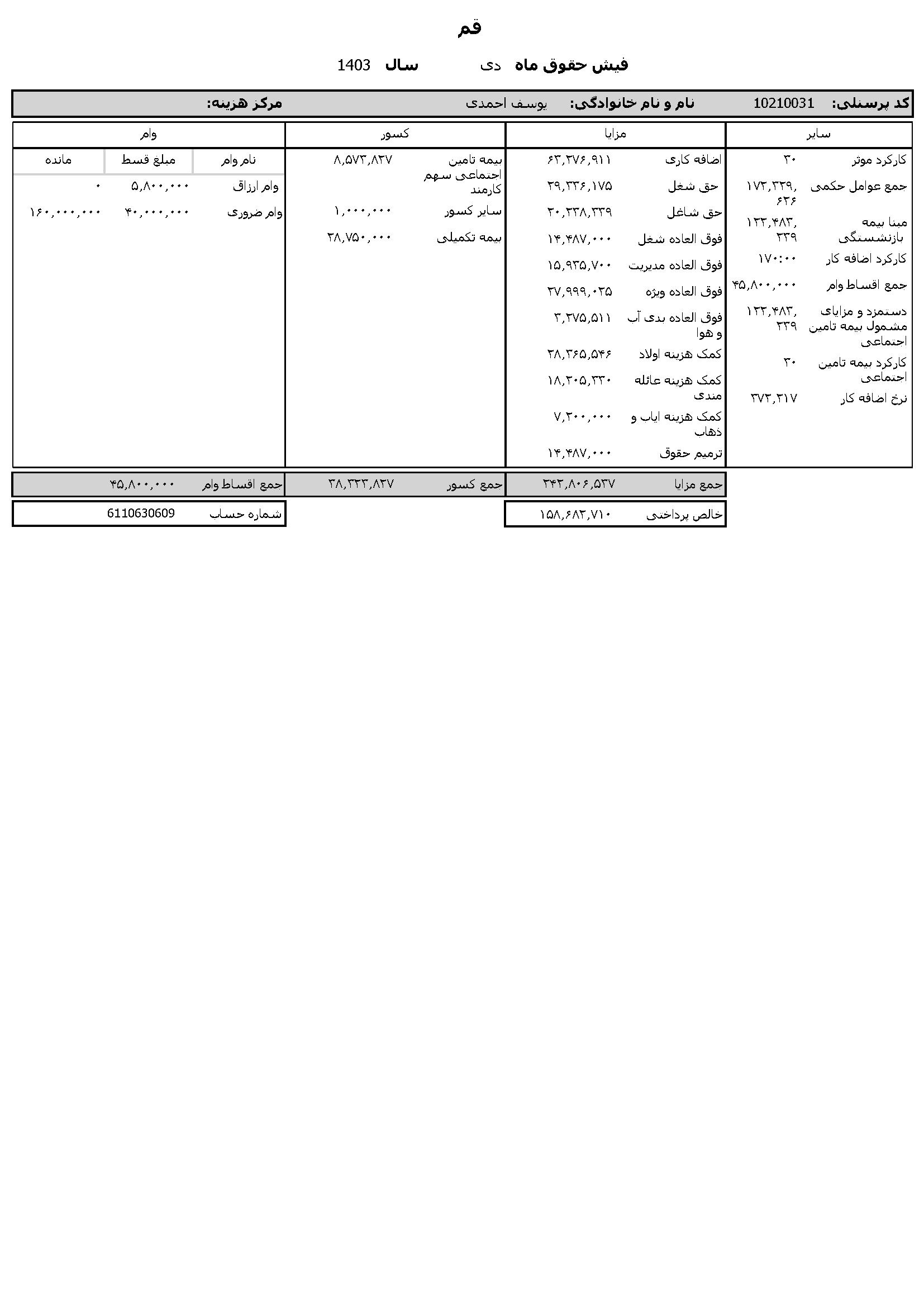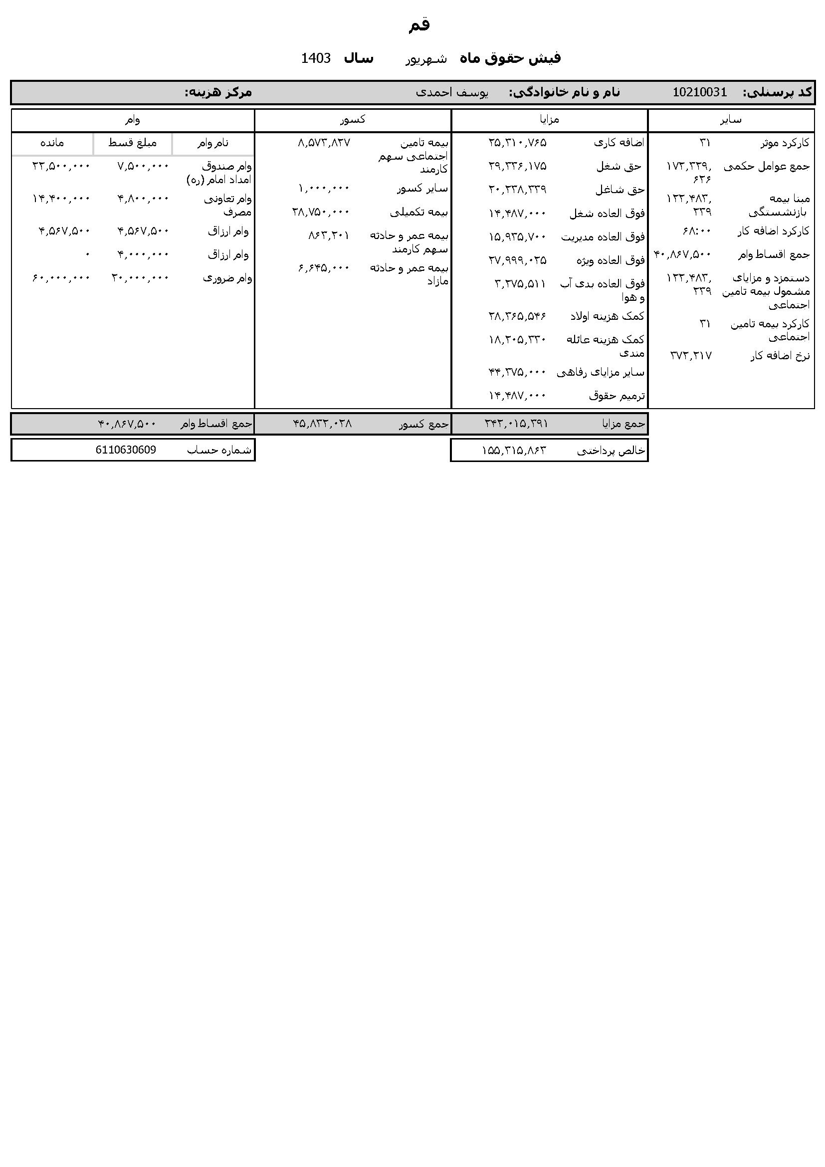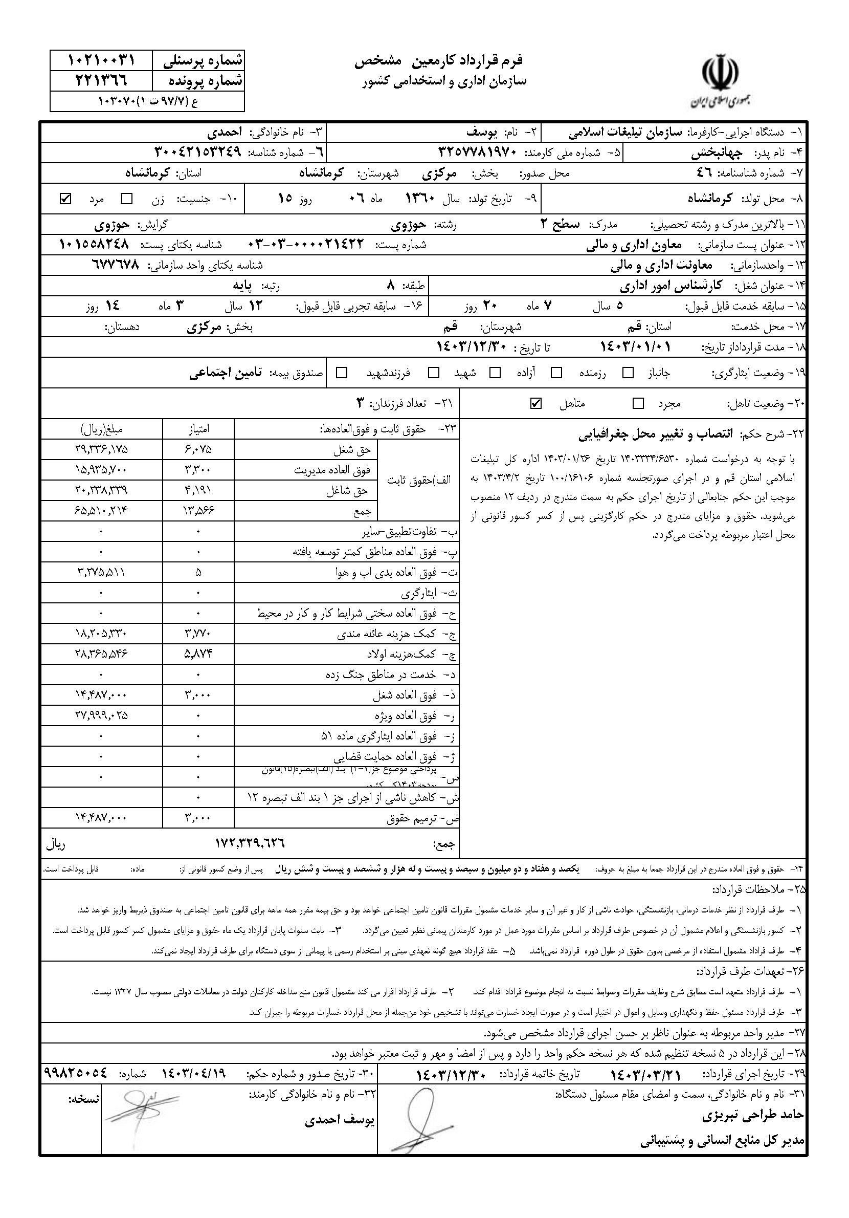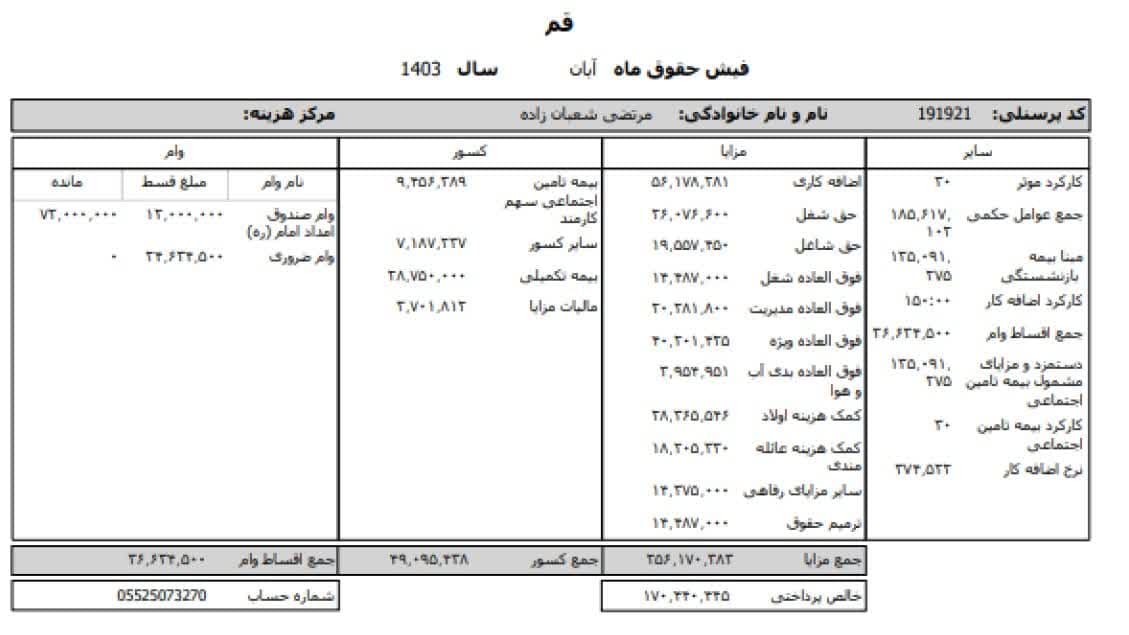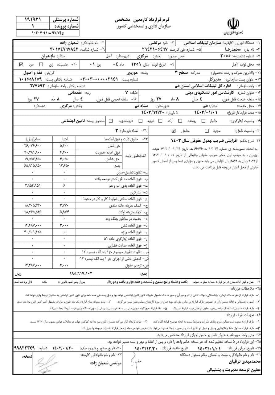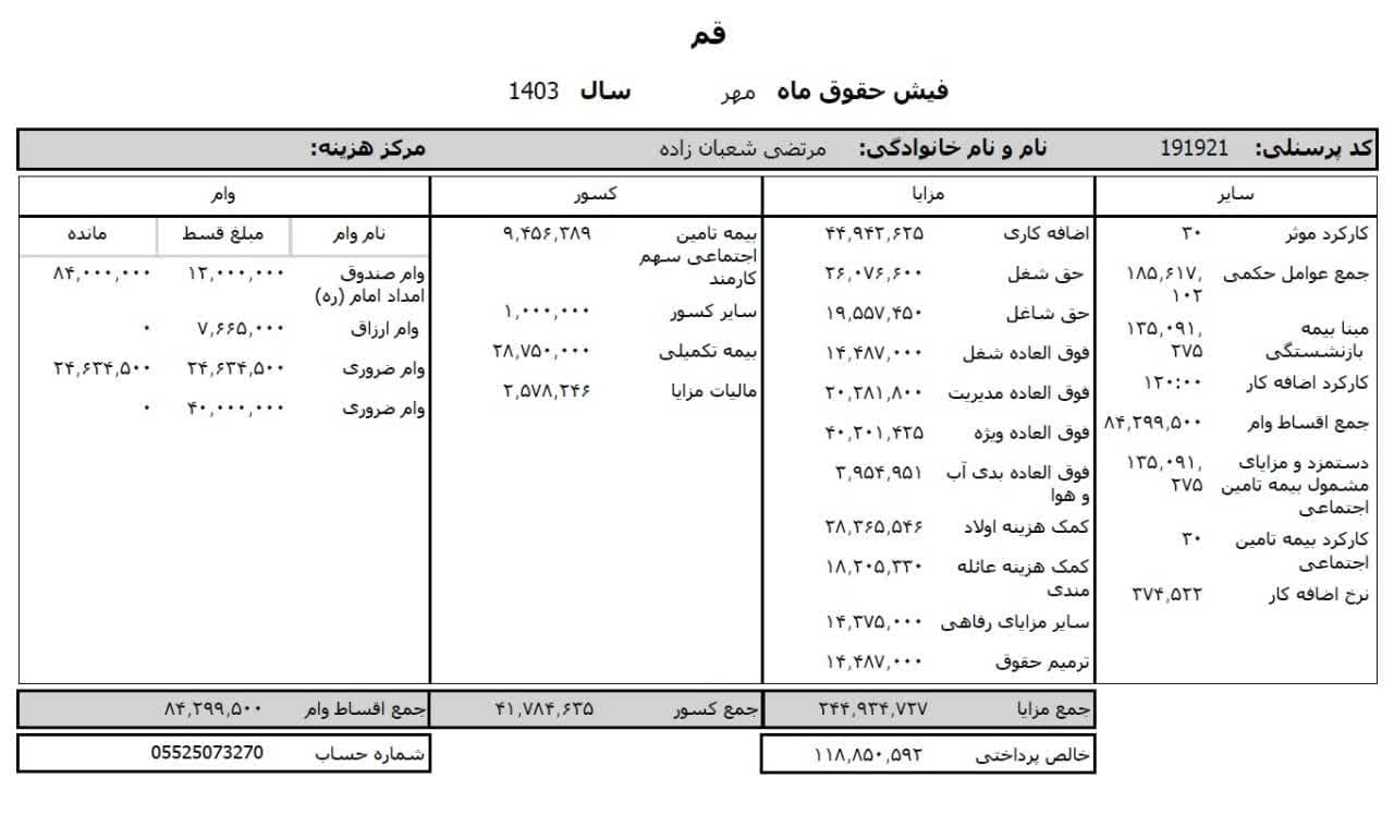 به گزارش روابط عمومی سازمان تبلیغات اسلامی، حقوق عمومی اطلاعات حقوق و مزایای 12 ماهه حجت الاسلام والمسلمین مرتضی شعبانزاده مدیر کل تبلیغات اسلامی استان قم و فیش حقوقی 12 ماهه حجت الاسلام والمسلمین یوسف احمدی معاون اداری و مالی منتشر شد.