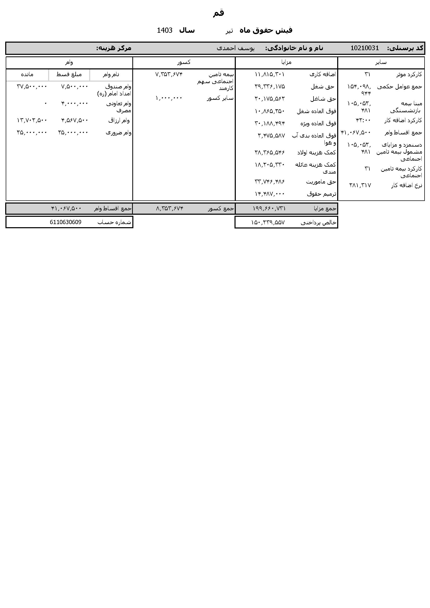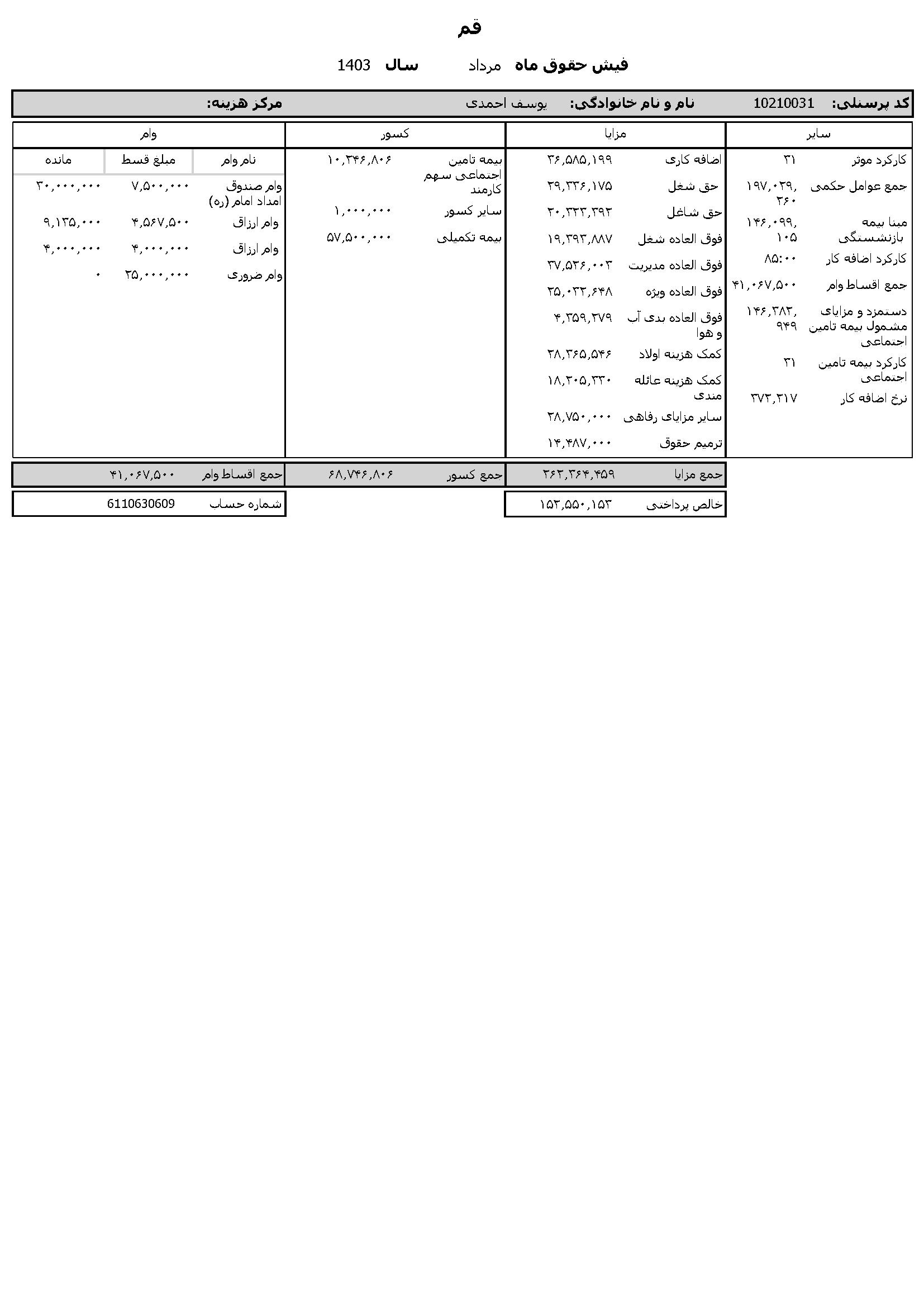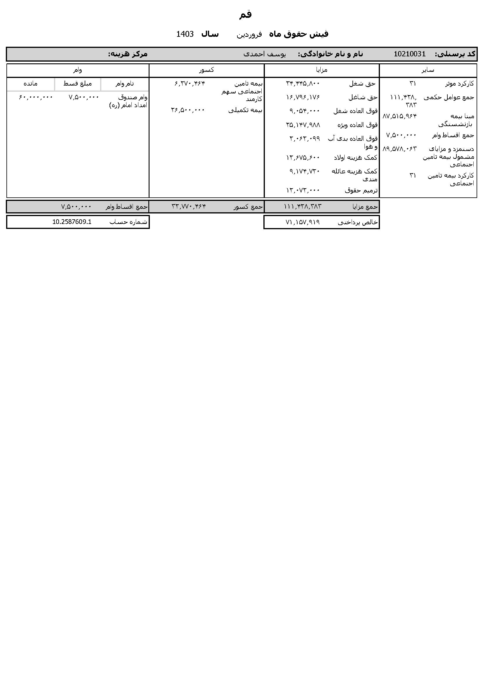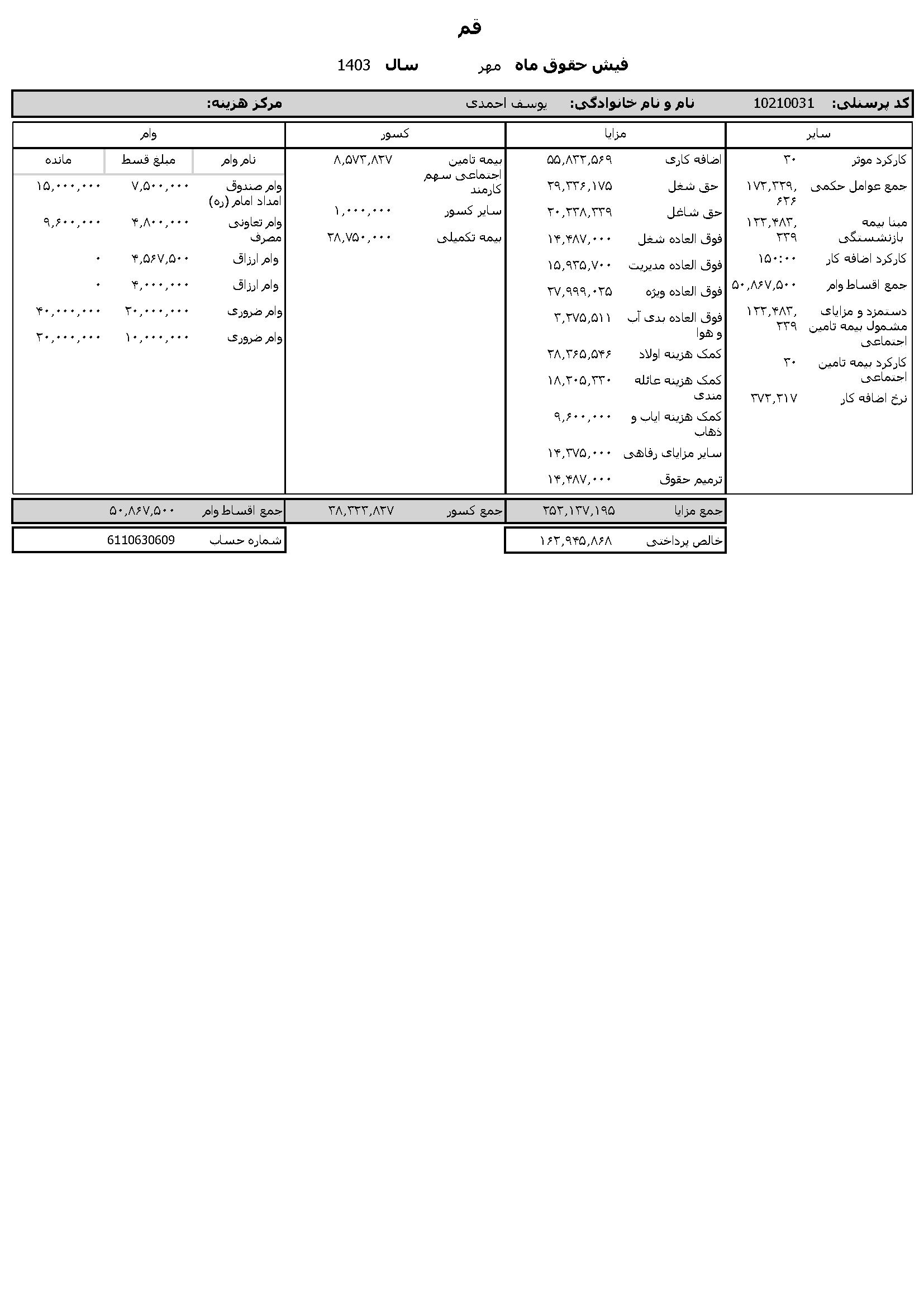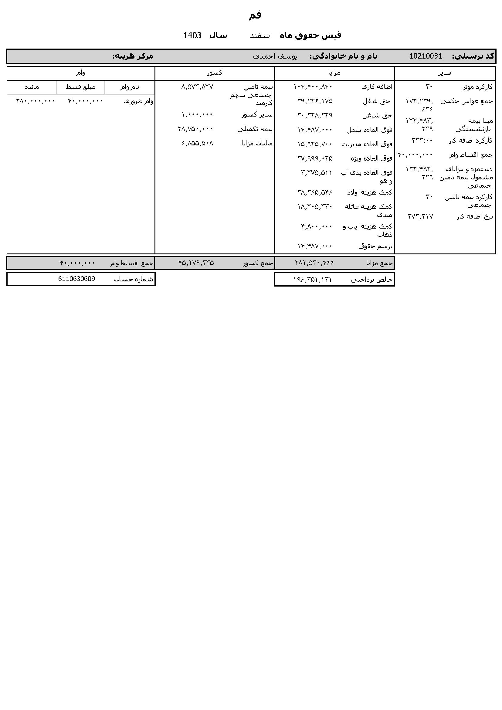 به گزارش روابط عمومی سازمان تبلیغات اسلامی، حقوق عمومی اطلاعات حقوق و مزایای 12 ماهه حجت الاسلام والمسلمین مرتضی شعبانزاده مدیر کل تبلیغات اسلامی استان قم و فیش حقوقی 12 ماهه حجت الاسلام والمسلمین یوسف احمدی معاون اداری و مالی منتشر شد.