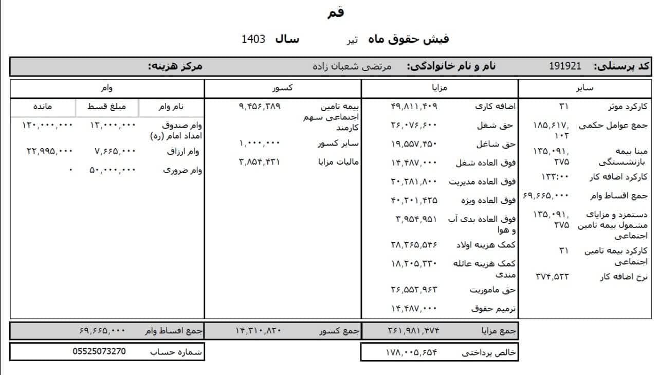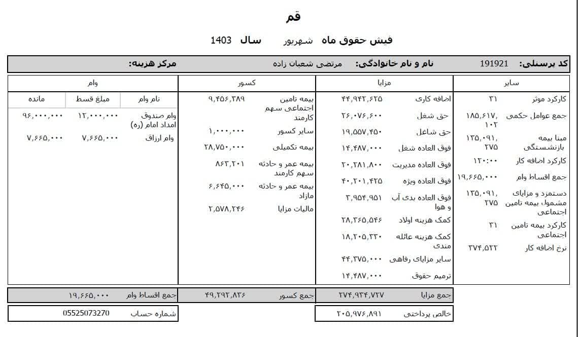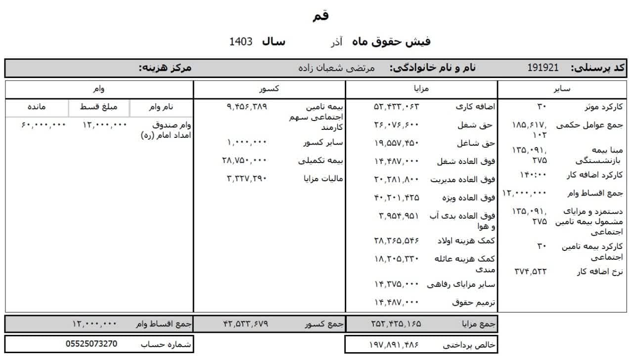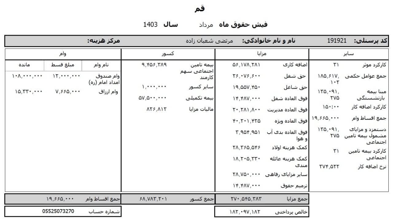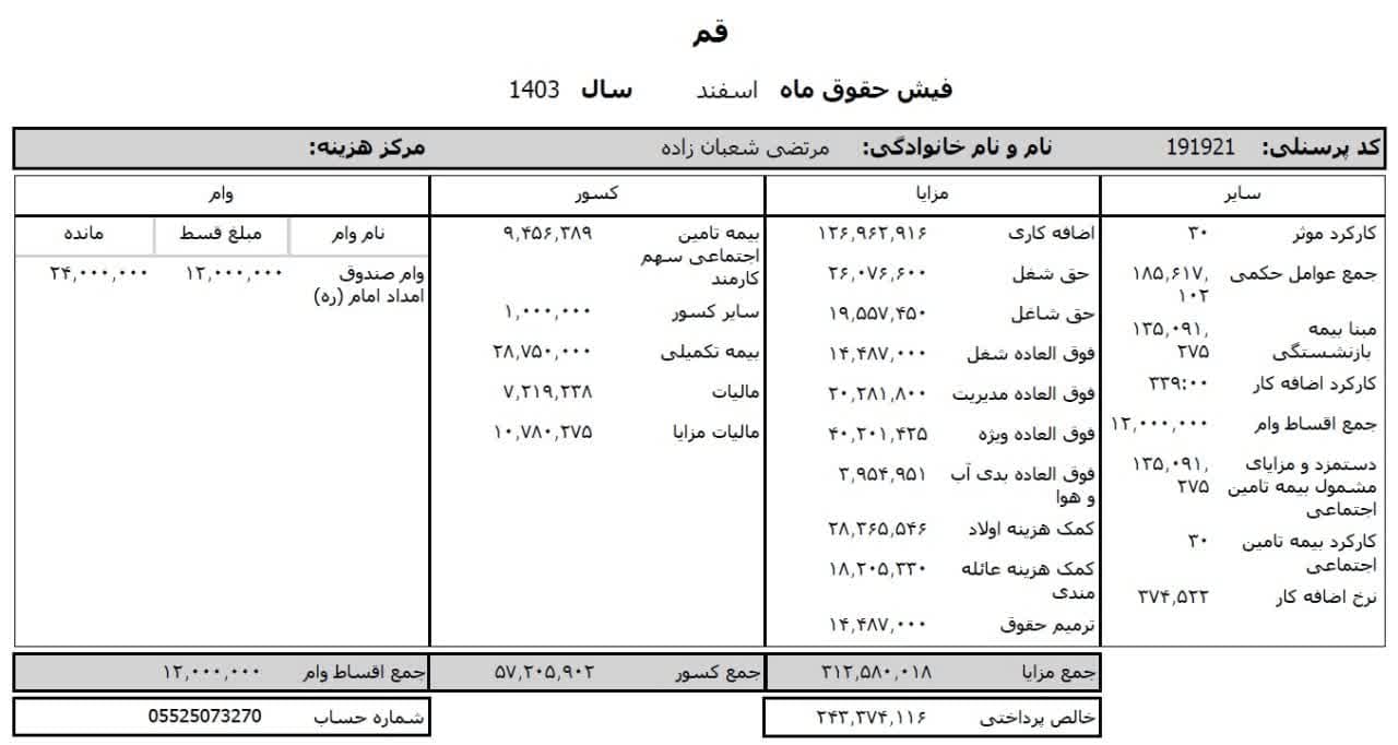 حقوق عمومی اطلاعات حقوق و مزایای ۱۲ ماهه مدیر کل تبلیغات اسلامی استان قم و فیش حقوقی ۱۲ ماهه معاون اداری و مالی منتشر شد.