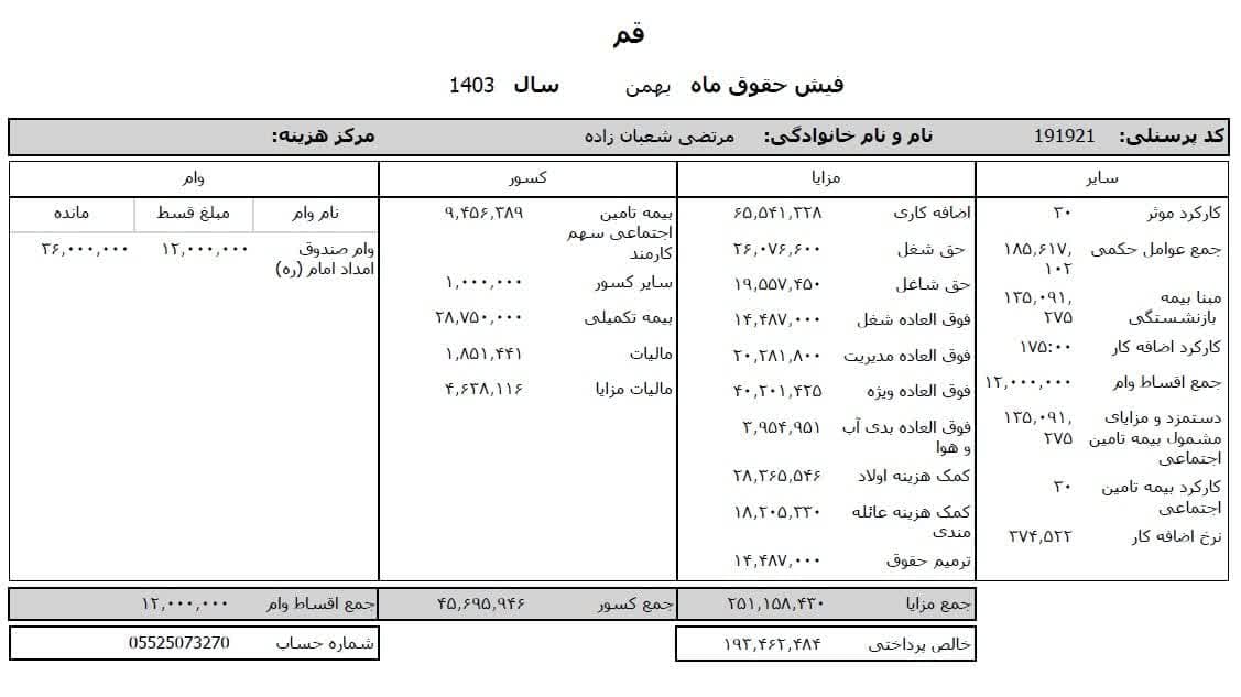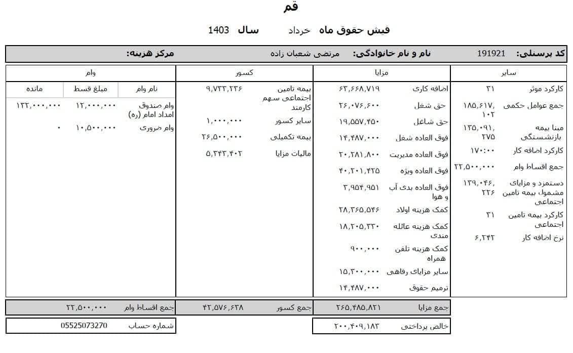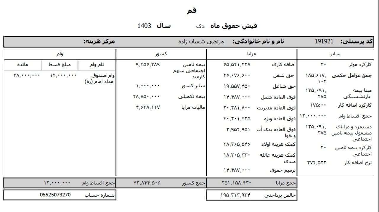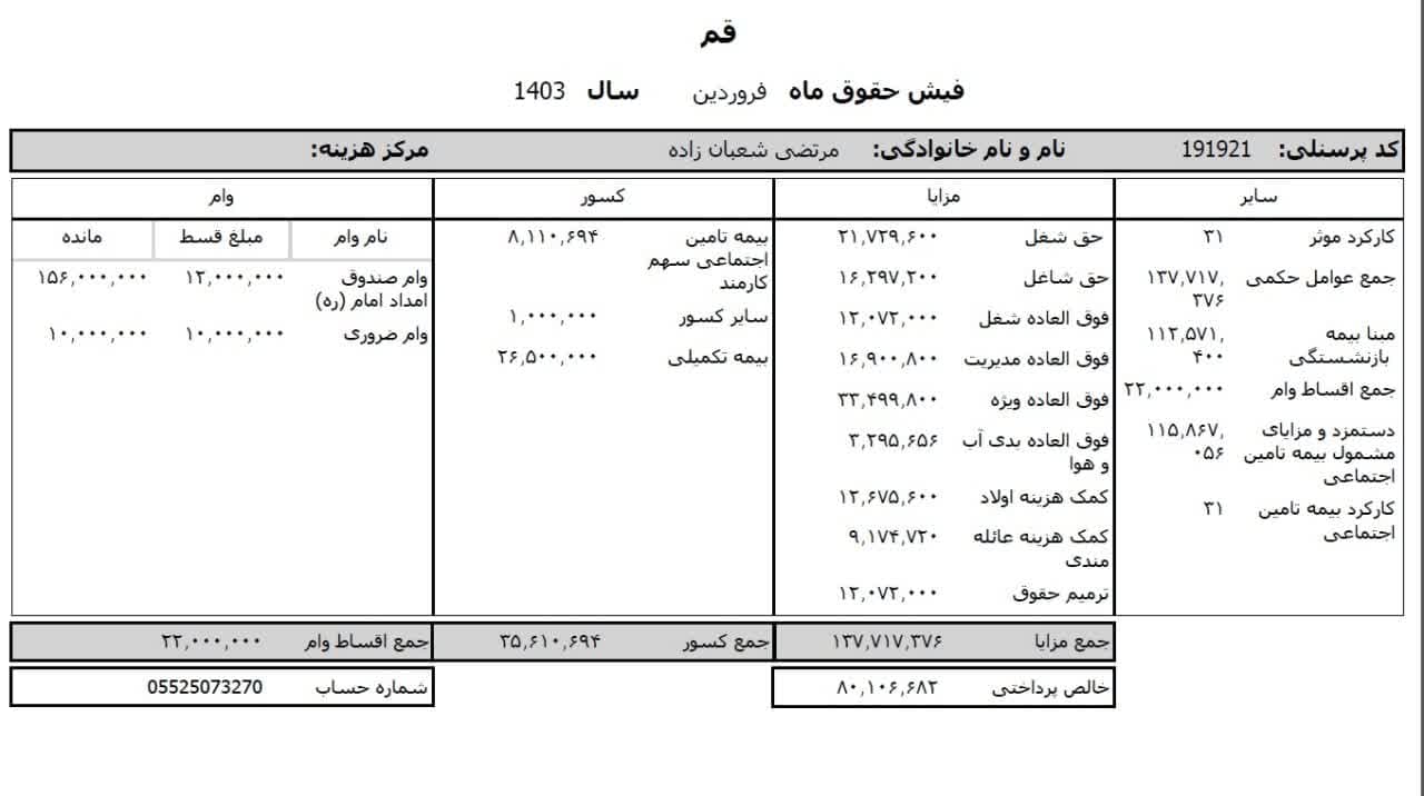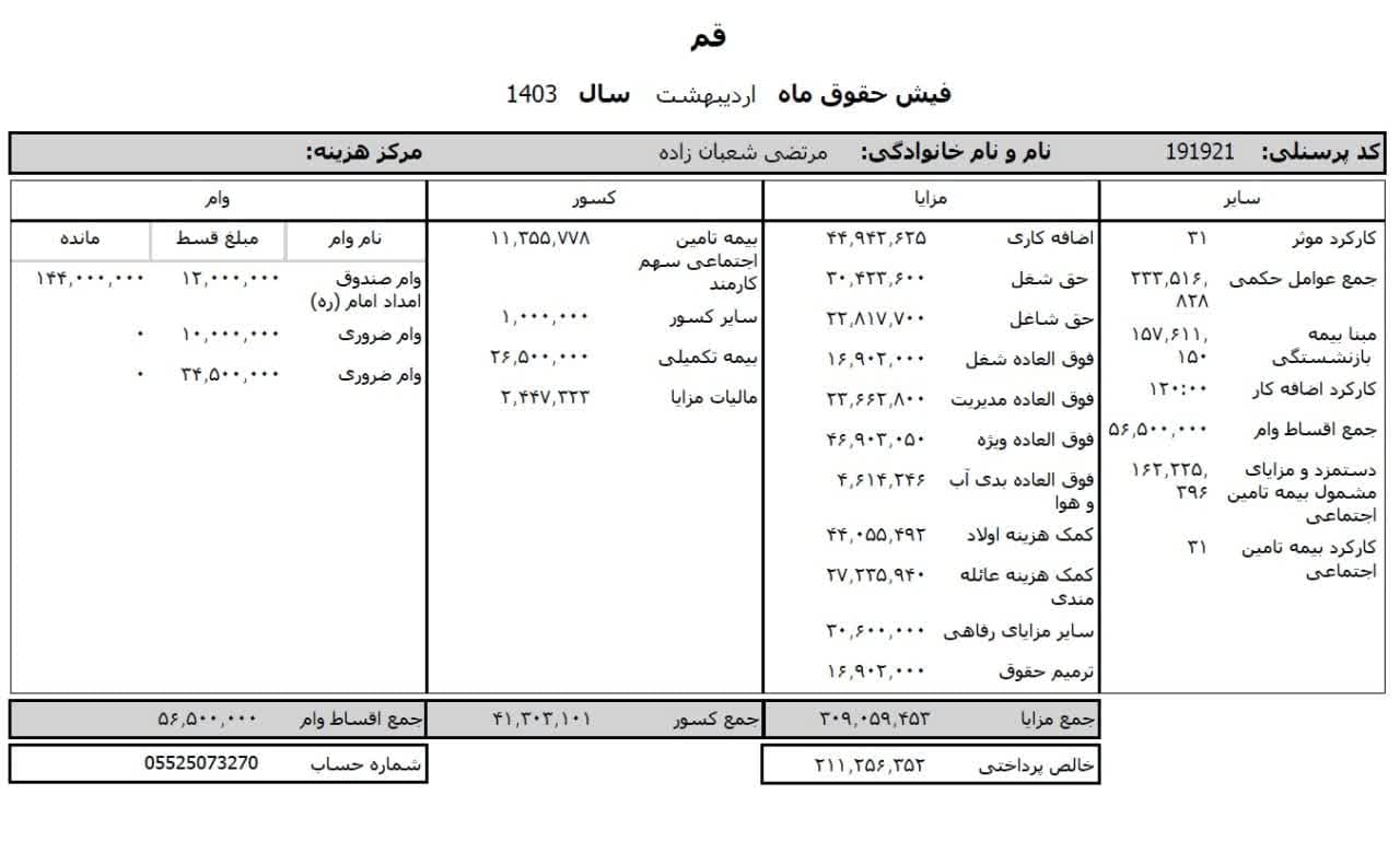 حقوق عمومی اطلاعات حقوق و مزایای ۱۲ ماهه مدیر کل تبلیغات اسلامی استان قم و فیش حقوقی ۱۲ ماهه معاون اداری و مالی منتشر شد.