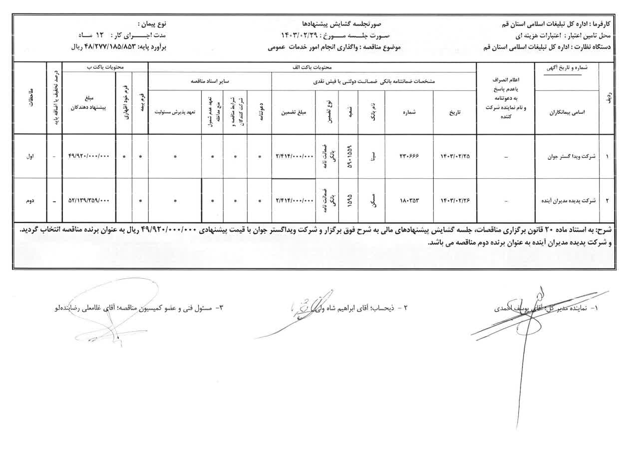 گفتنی است، مناقصه دو شرکت کننده داشته که شرکت ویدا گستر جوان برنده آن شده است.