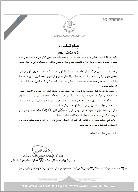 درگذشت جانگداز بانوی قرآنی، خانم پروین اختردانش را که عمری را در مسیر ترویج کلام وحی و تعالیم اسلامی سپری نمود، به عموم قرآنآموزان، مربیان قرآن، خانوادهی محترم ایشان و تمامی دلدادگان به فرهنگ قرآنی در استان بوشهر، تسلیت عرض مینماییم.