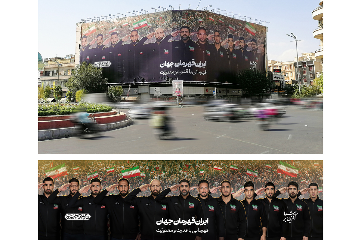 به گزارش روابط عمومی سازمان تبلیغات اسلامی، همزمان با درخشش غرورآفرین تیم ملی کشتی آزاد ایران در مسابقات جهانی زاگرب ۲۰۲۵ و کسب عنوان قهرمانی جهان، تازهترین دیوارنگاره میدان انقلاب تهران با نقشی از ملیپوشان قهرمان تیم ملی کشتی آزاد کشورمان رونمایی شد. این طرح با شعار محوری «قهرمانی با قدرت و معنویت» اکران و در استودیو رواق تولید شده است. طراحی این دیوارنگاره با حمید ژولانژاد بوده و مدیریت هنری آن را علی بایبوردی بر عهده داشته است.