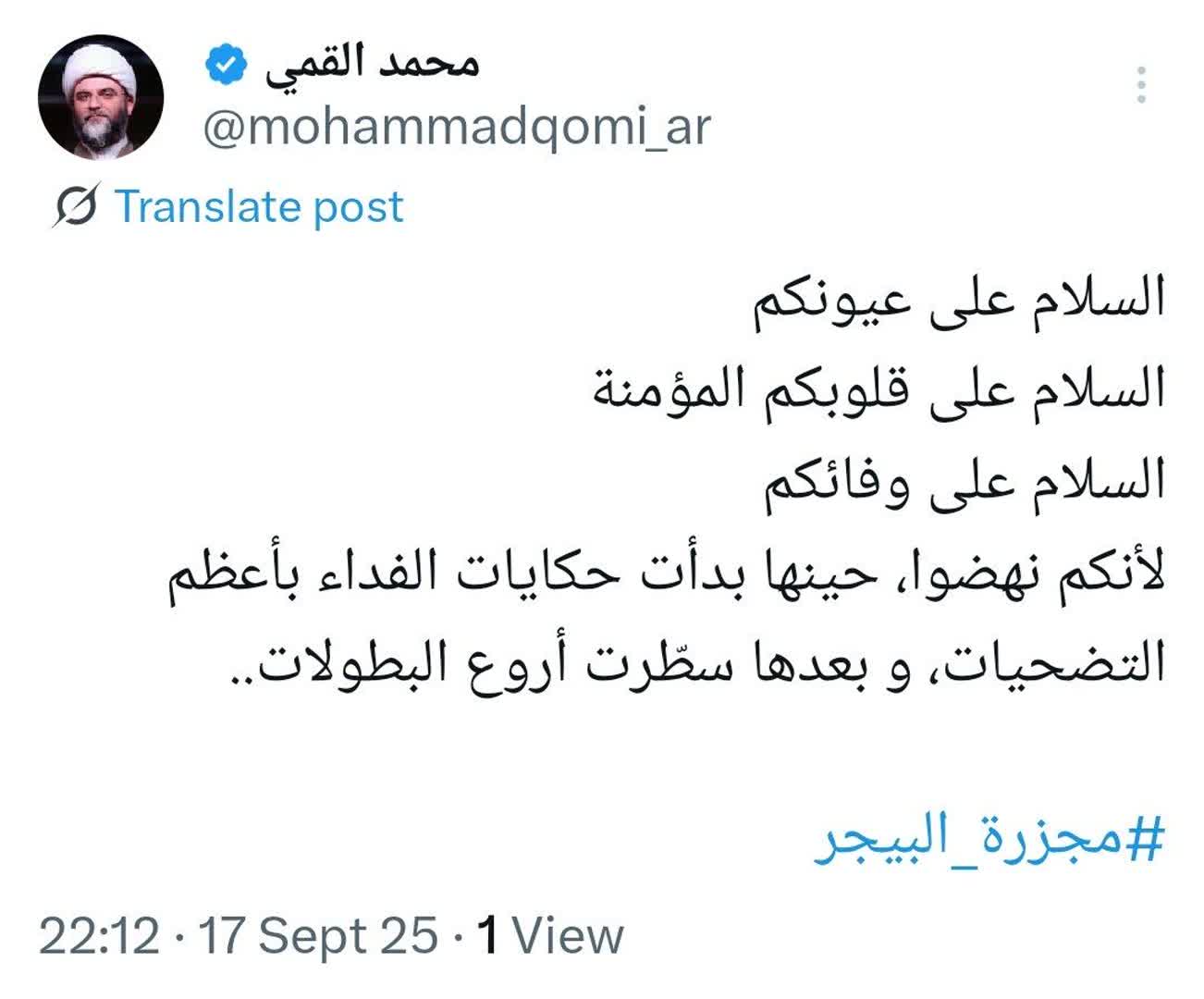 به گزارش روابط عمومی سازمان تبلیغات اسلامی، حجتالاسلام محمد قمی، رئیس سازمان تبلیغات اسلامی در صفحه شخصی خود در شبکه اجتماعی ایکس ویژه کاربران عرب زبان در سالگرد حادثه انفجار پیچرها در لبنان نوشت؛