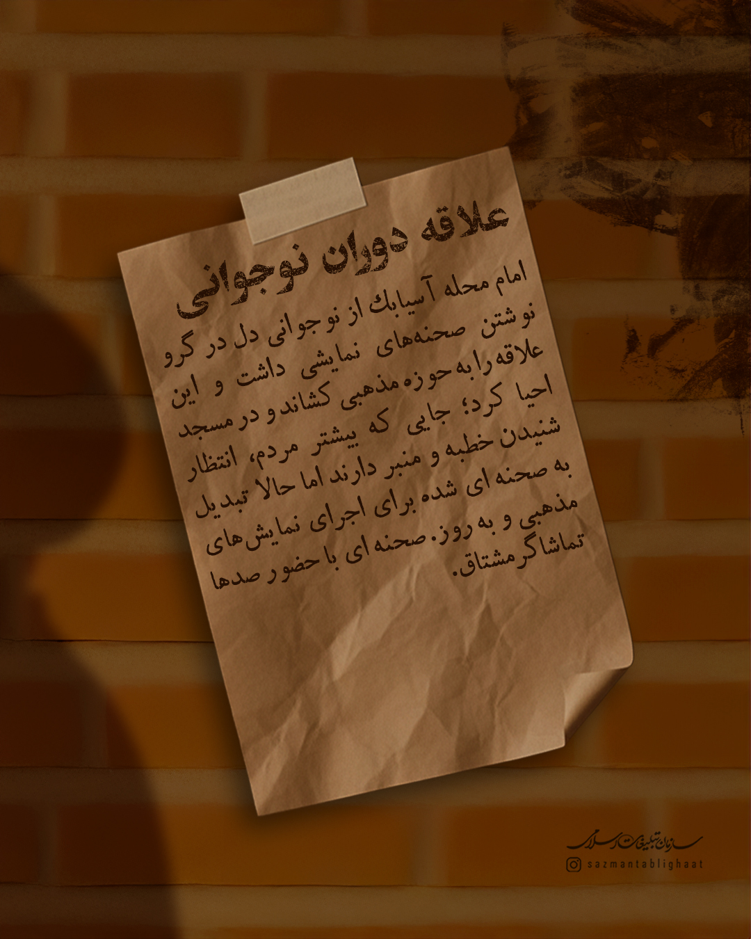 حجتالاسلام «محمود گلمحمدی» امام محله آسیابک در شهر زرندیه استان مرکزی است. او که از نوجوانی به ادبیات و نمایشنامهنویسی علاقهمند بود، با نوشتن نمایشنامه و اجرای نمایش در مسجد تجربهی متفاوتی برای اهالی این محله فراهم کرده است. اتفاقی که منجر به رونق مسجد و حضور فعالانه مردم، خصوصا جوانان و نوجوانان، در مسجد شده است. در این نشریه دیجیتال مروری میکنیم بر ابتکار این روحانی جوان و تلاشهای او در راستای کمک به محله.