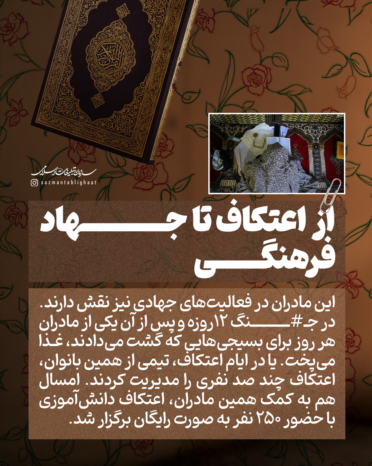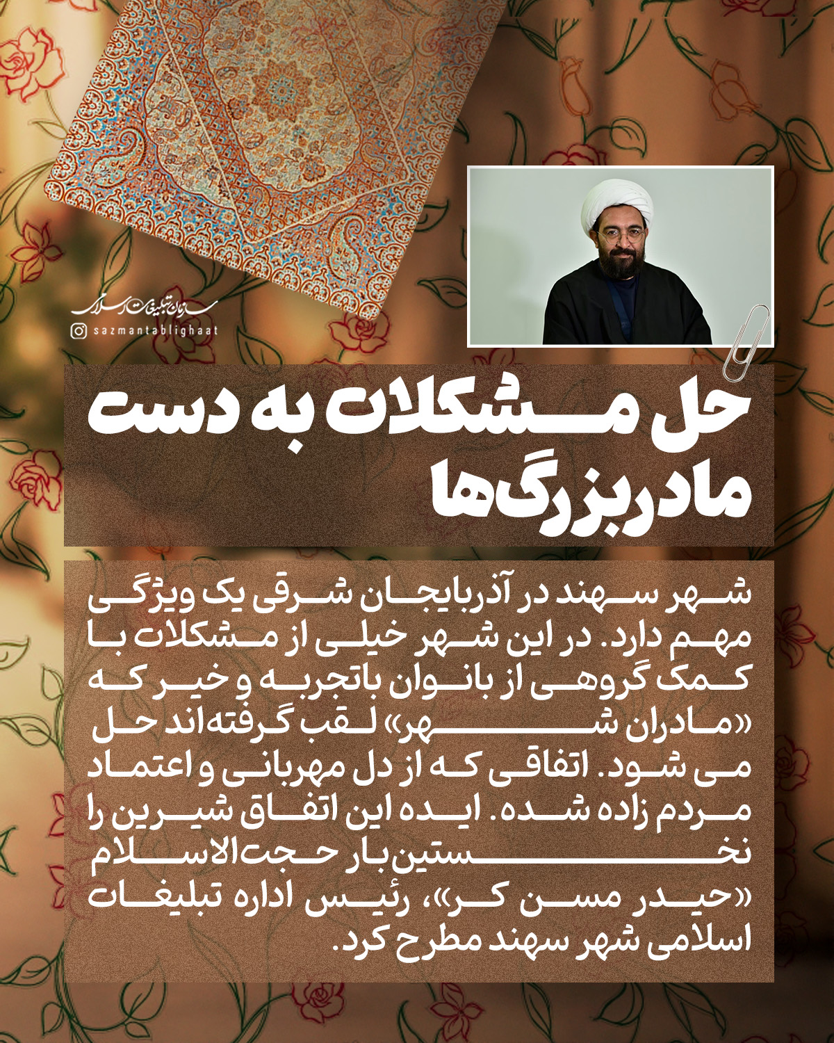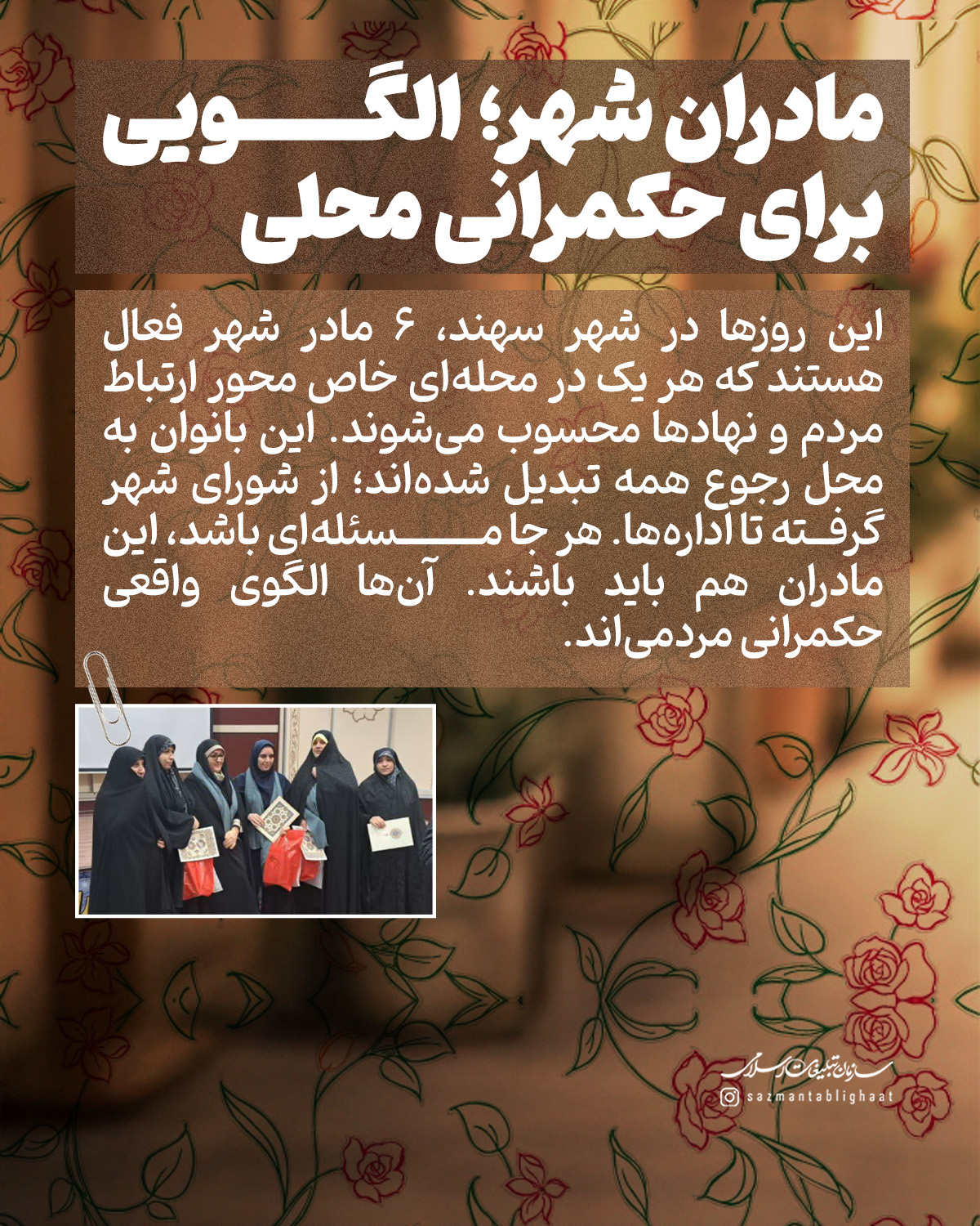 به گزارش روابط عمومی سازمان تبلیغات اسلامی، در شهر سهند آذربایجان شرقی، گروهی از بانوان خیر و باتجربه با نام «مادران شهر» نقشی کلیدی در حل مشکلات محلات ایفا میکنند. این طرح که به ابتکار حجتالاسلام حیدر مسنکر، رئیس اداره تبلیغات اسلامی سهند، شکل گرفته، مادران محلی را به حلقه ارتباط میان مردم و نهادهای شهری تبدیل کرده است. از کمک به خانوادههای نیازمند و مدیریت اعتکاف گرفته تا میانجیگری در مسائل اجتماعی؛ الگویی برای حکمرانی مردمی. در این شماره از نشریه دیجیتال از سهند و طرح مادران شهر میخوانیم.