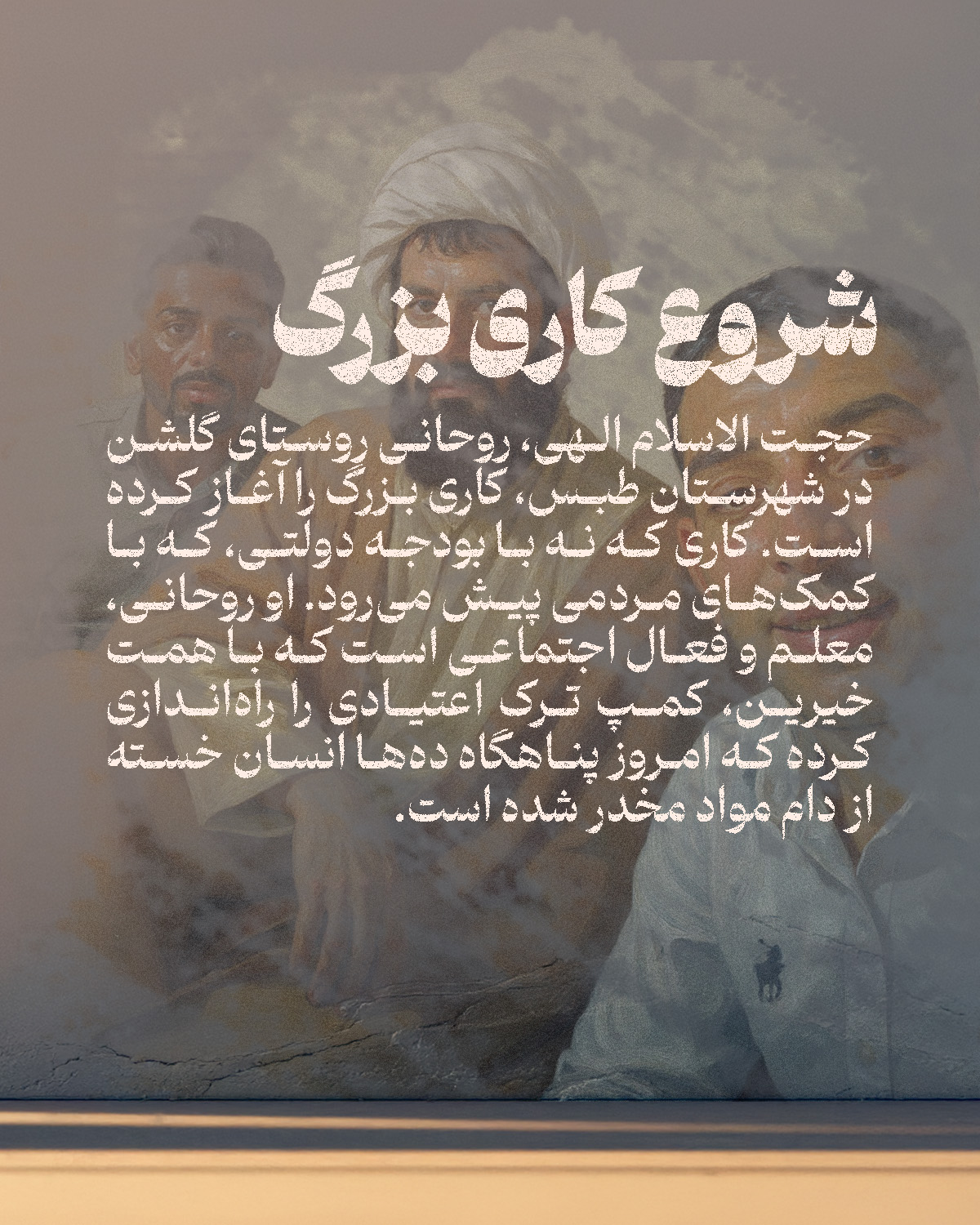 حجتالاسلام الهی، امام محله روستای گلشن شهرستان طبس است. روحانی جوانی که با همت خیرین در این روستا کمپ ترک اعتیاد راه انداخته و امروز پناه دهها انسانی است که از دام اعتیاد رها شدهاند. در این نشریه دیجیتال مروری میکنیم بر ابتکار این روحانی دغدغهمند و تلاشهای او در راستای حل بحران اجتماعی محله.